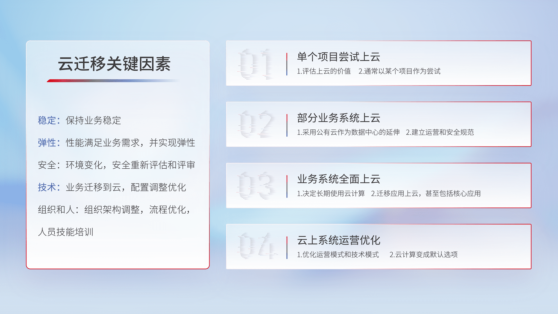 结合实际业务,,从规划设计、、、、云平台选型、、云原生改造、、、数据迁移、、、、集成交付,,,迁移全过程为客户识别最佳上云路径,,,做好风险识别管理,,,设计网络架构、、、、身份权限、、、安全审计合规、、、操作审计、、、、日志审计、、、、监控告警策略、、、、多站点容灾设计等,,,对云上基础设施进行整体规划,,,,提升IT治理水平,,以满足弹性、、、、高可用、、、高性能的需求。。