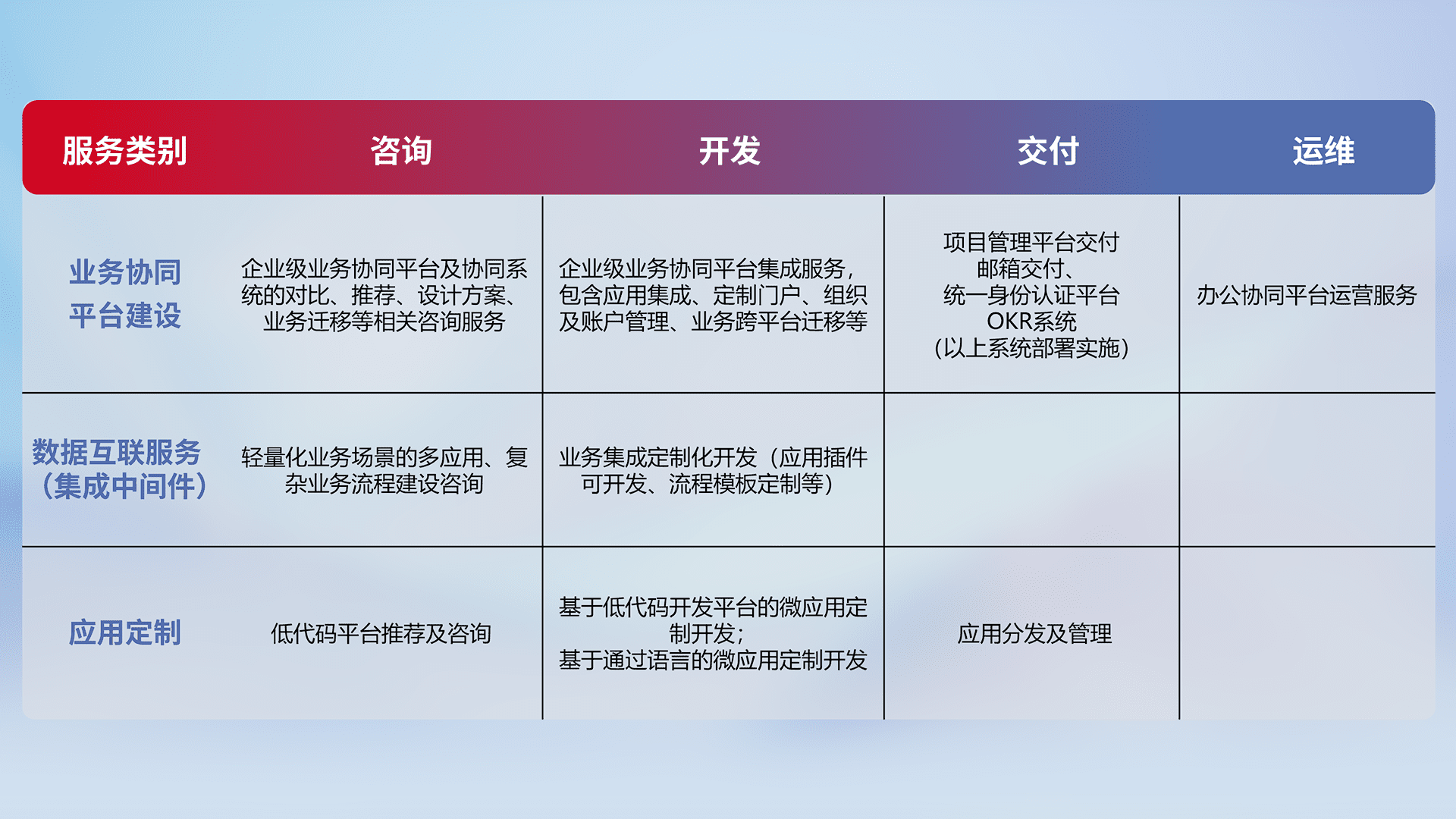 针对钉钉、、企微、、、IDaas等平台级产品提供产品的规划、、、、方案、、、、交付、、、定制化开发等服务,,,,实现如统一协同办公、、、智能客户服务、、、、混合会议管理、、、智能数据查询、、等业务场景,,,,实现数字化转型。。。